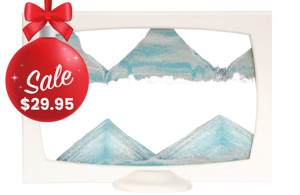 The White Colored frame is paired with a fun belnd of arctic blue, baby blue, white and silver glitter. If you are giving this as a gift, it's one that they will talk about for years to come! Your Screenie Ice Age Moving Sand Art will do several times a day what mother earth takes millions of years to accomplish.