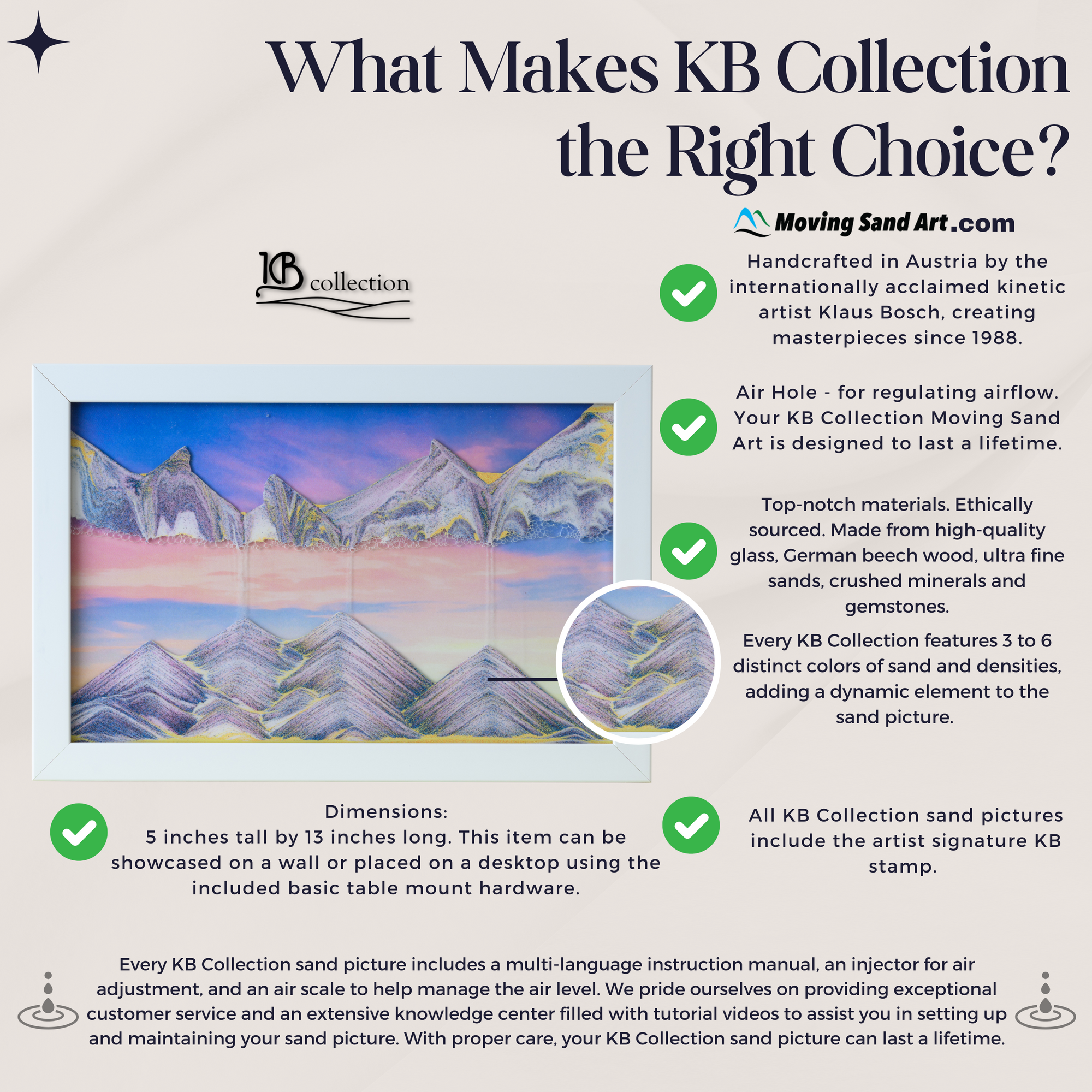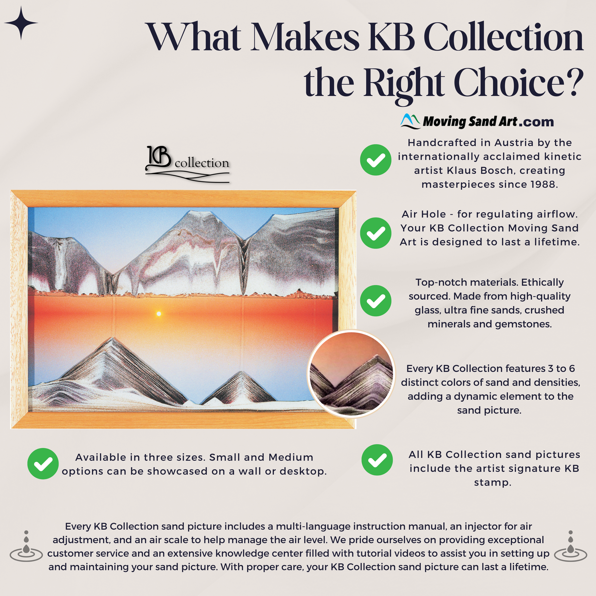 The KB Collection moving sand art is interactive, ever-changing, mesmerizing, and versatile handcrafted art pieces. Turn the sand picture over to watch the battle of the elements: The sand just wants to settle at the bottom, the air just wants to escape to the top, the water hosts the party. The result is the sand trickles between the air bubbles to create fascinating stratifications in the sand mountains.